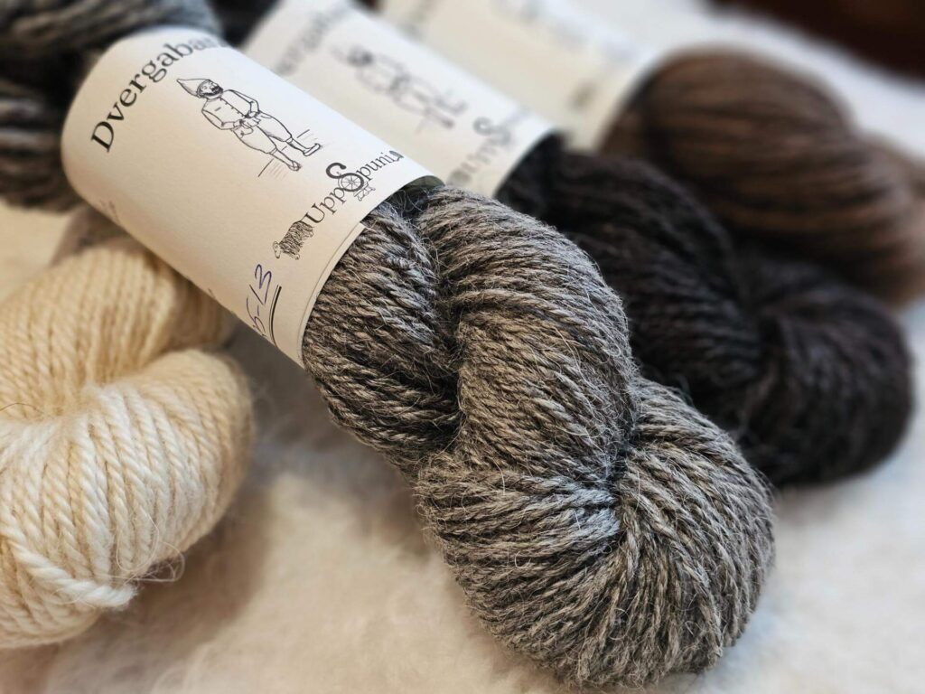 Dvergaband (dwarf yarn) is 3ply, bulky weight – 100 meters (109 yards) per 100 grams. Needle size 5,0 to 6,5 mm is recommended: Gauge 6,0 mm needle is 13 sts and 18 rounds for 10x10cm. We reccommend our Dvergaband for projects designed to keep you especially warm, such as a big, cosy sweater for the wintertime. The farmers all around us often request a sweater from Dvergaband to use for their outdoor work, but the wool is quite adjustable to different temperatures and has the unique quality of keeping them warm even if they get a little wet in the rain or snow.