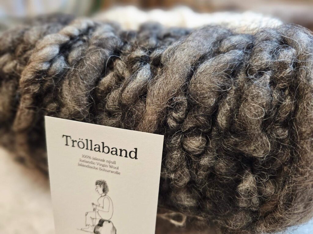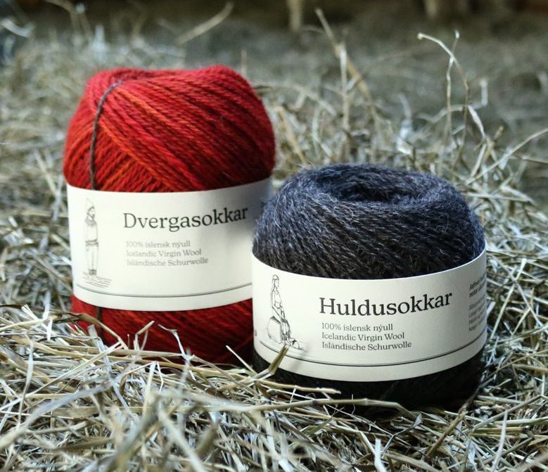 Dvergasokkar and Huldusokkar – our 3ply sock yarns with no plastics! We select the fleeces with the longest and strongest tog to create these durable sock yarns, and boy, does it work. With just the right amount of lanolin retained in the yarn, they’re also a little moisturising, making your feet both warm and soft. On cold days, Dvergasokkar are the thicker ones to wear outside when working or on a hike, even skiing or riding a horse. In the evening inside the house, Huldusokkar are slightly thinner and keep your feet warm on cold floors, in front of the fireplace, or in bed at night. Dvergasokkar is the same yarn weight as Dvergaband (100 meters per 100 grams ) and so the ribbing can decorated with Dvergaband. The same for Huldusokkar and Hulduband (both 200 meters per 100 grams).