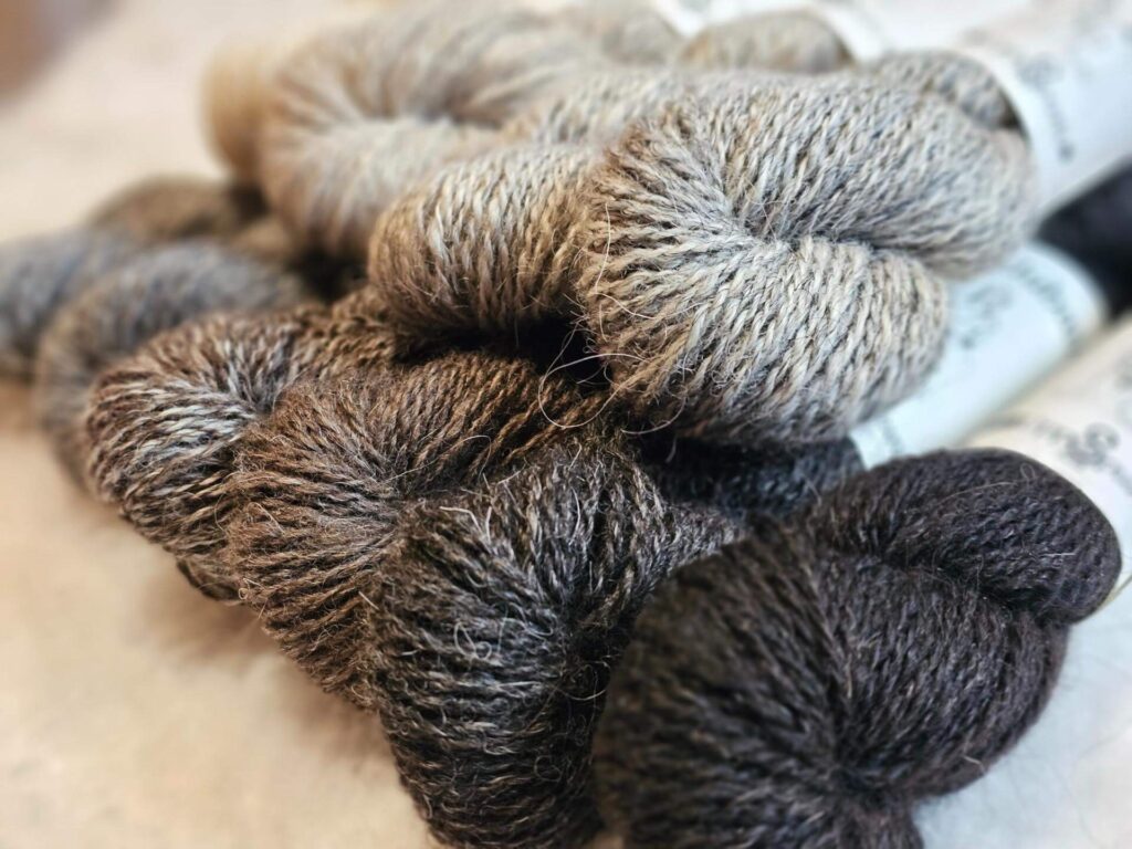 We make yarn in the natural colors of each individual fleece. They are chemical-free and we do not dye our natural color yarn to create standardised shades. Each batch is unique as each sheep is unique. We use mild, nature-friendly soap when washing and treat every fleece with care and respect, selecting the type of yarn we make from each fleece based on the characteristics of that fleece.